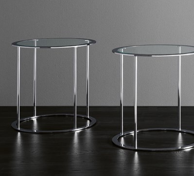 Ein klassischer Tisch mit rechteckiger Form in einer verchromten Ausführung oder aus schwarzem Metall, mit einer Platte und Unterseite aus Glas.