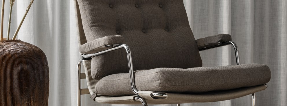 Der Sessel Karin 73 aus dem klassischen Bruno Mathsson-Designsortiment bietet mit seinem fein verchromten Rahmen und der gesteppten Polsterung eine elegante Sitzgelegenheit.